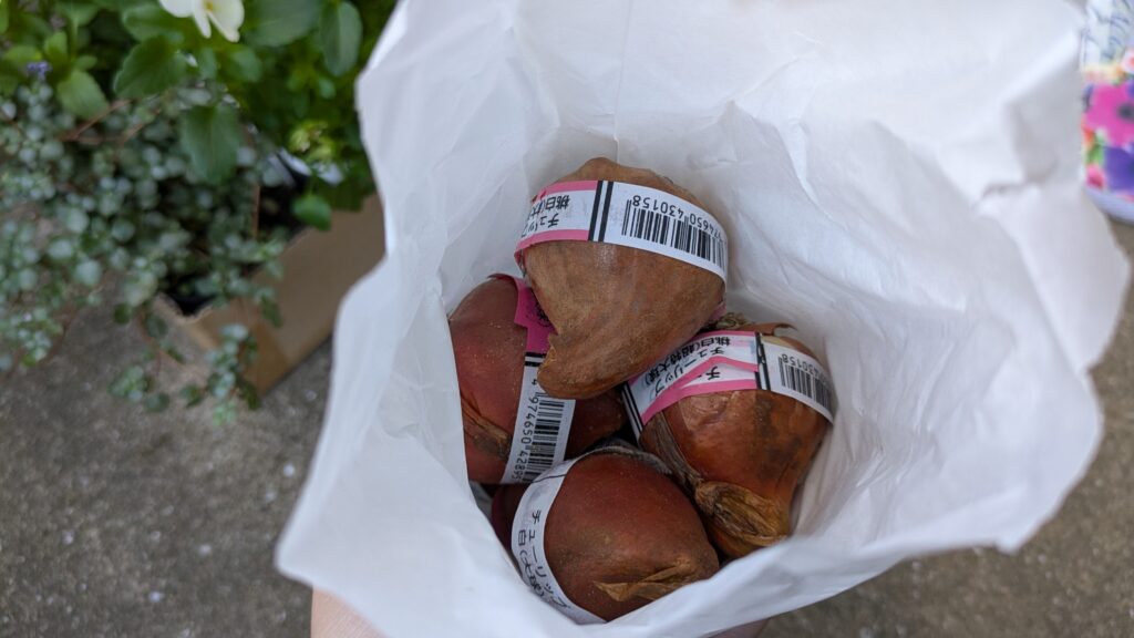 ビオラの向こう側に3つほどチューリップの球根を植えています。