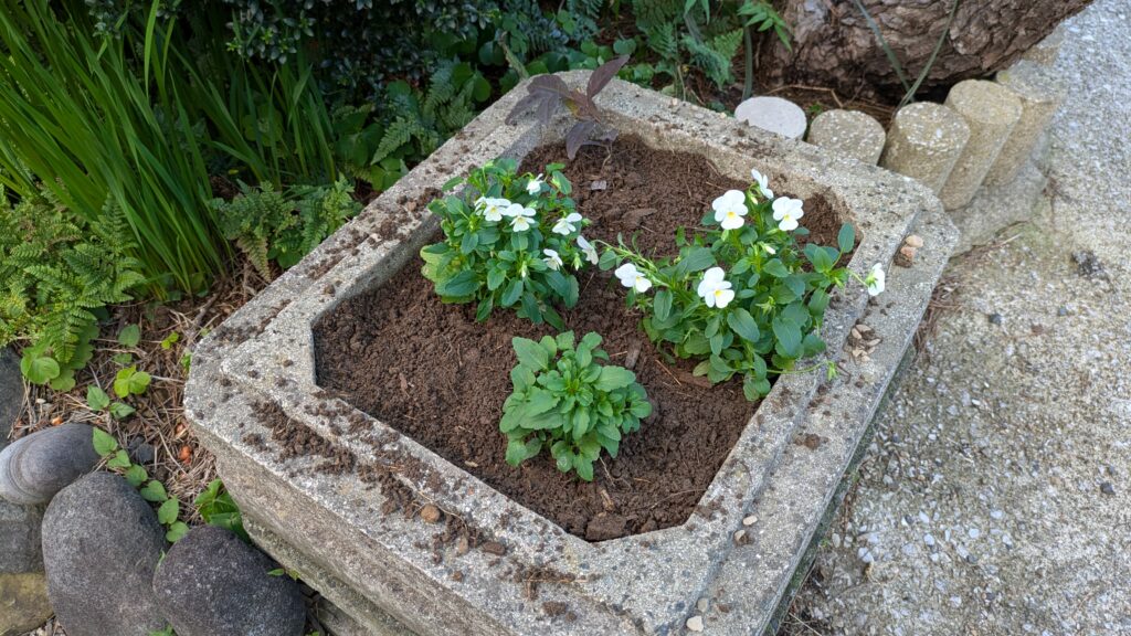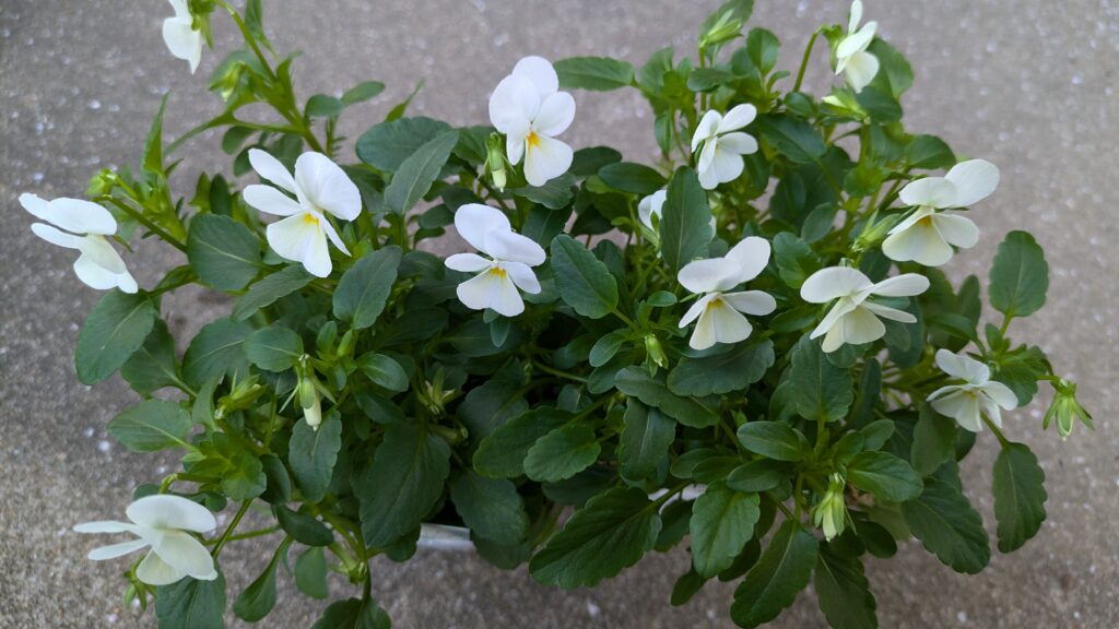 ちなみに白のビオラは丁字草との寄せ植えに使いました。